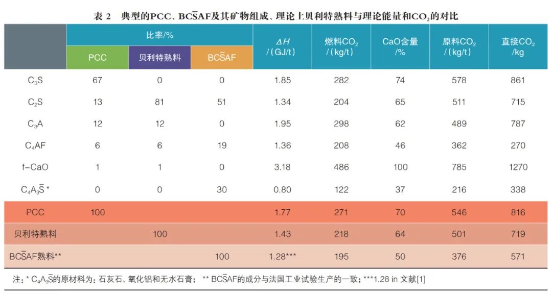 表2為典型的硅酸鹽水泥熟料(Por t land Cement Clinker)、BC AF熟料、理論上的貝利特熟料理論能量和CO2的對(duì)比。