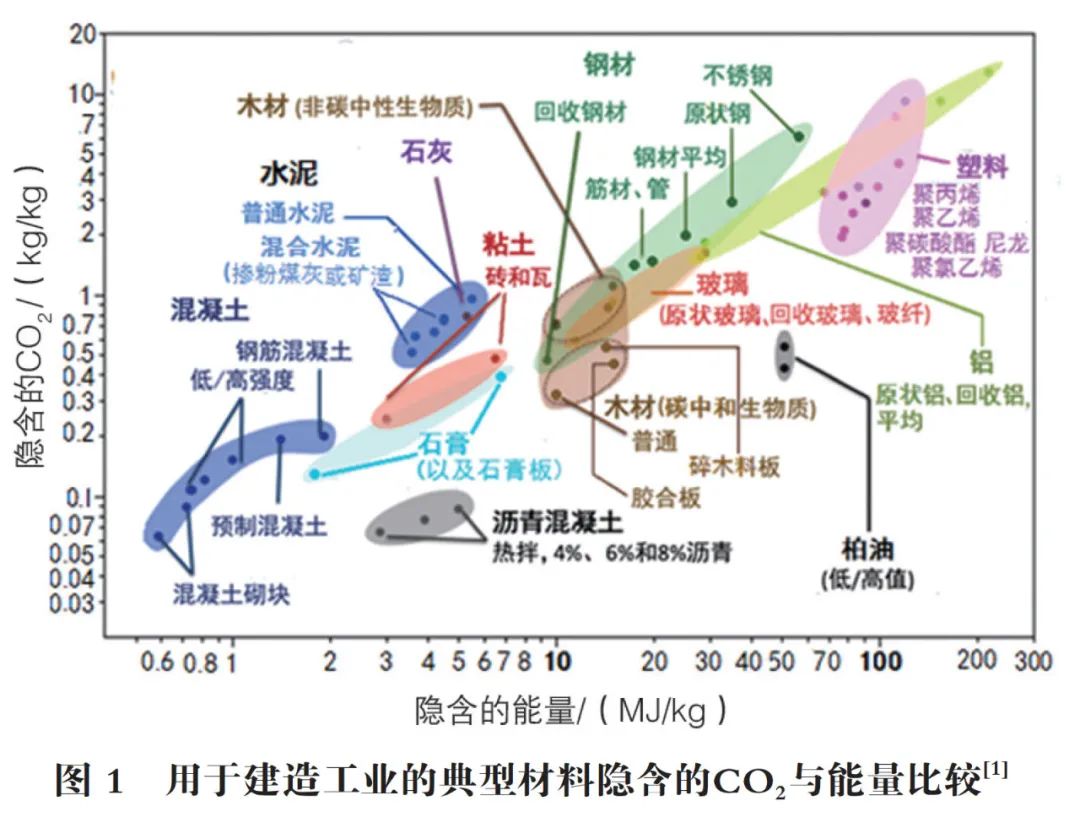 引自文獻(xiàn)[1]的圖1是由一個(gè)無黨派、非營利的獨(dú)立組織世界資源協(xié)會(huì)所編制的,是對(duì)以CO2當(dāng)量表示的全球溫室氣體來源的分析,顯示按不同材料每1kg所隱含的能量與隱含的CO2排放量。混凝土和水泥作為兩個(gè)獨(dú)立產(chǎn)業(yè)計(jì)算,但都包含碳足跡。由圖1可見,在全部主要的建造材料中,混凝土的潛在能耗與CO2排放量是最低的。就連一直在承受著“耗能大戶”名聲壓力的水泥產(chǎn)業(yè),在圖1中所見其每1kg產(chǎn)量的碳排和也比最碳排量的其他產(chǎn)品的低到1個(gè)數(shù)量級(jí);而每1kg素混凝土的砌塊碳排量只有60g,鋼筋混凝土的也只有200g,塑料的則達(dá)約10000kg。各種材料的單位碳排量與能耗呈線性正相關(guān)。