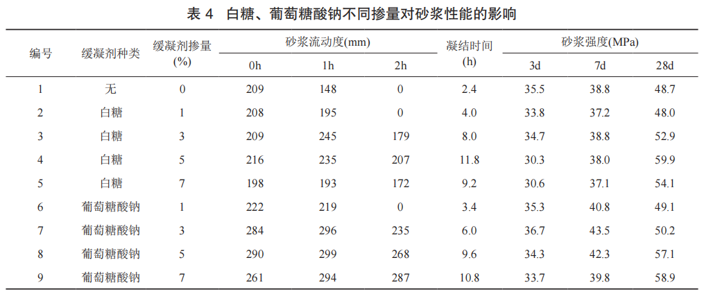 綜合評估六種緩凝劑對砂漿流動度、凝結(jié)時(shí)間和強(qiáng)度的影響,白糖和葡萄糖酸鈉不管是在緩凝效果還是對砂漿流動性保持能力上均具有明顯的優(yōu)勢。為深入了解緩凝劑摻量對砂漿綜合性能的影響,細(xì)化開展白糖和葡萄糖酸鈉的摻量研究,摻量分別為 1%、3%、5%、7%。試驗(yàn)結(jié)果見表 4。