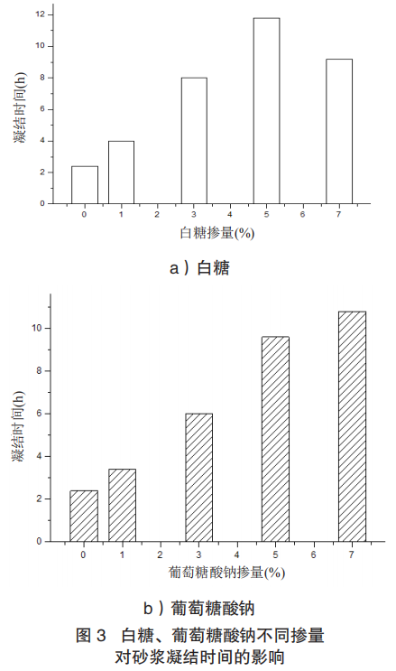 從圖 3a)可以看出,隨著白糖摻量的增加,砂漿凝結(jié)時(shí)間先增加后下降,白糖摻量從 0% 增加到5%時(shí),砂漿凝結(jié)時(shí)間從 2.4h 增加到 11.8h,而摻量增加到 7% 時(shí),砂漿的凝結(jié)時(shí)間反而下降到 9.2h。從圖 3b)可以看出,隨著葡萄糖酸鈉的摻量從 0% 增加到 7% 時(shí),砂漿的凝結(jié)時(shí)間呈現(xiàn)出單調(diào)增加的趨勢,從 2.4h 增加到 10.8h。從兩種緩凝劑對砂漿凝結(jié)時(shí)間的對比來看,0%~5% 摻量范圍內(nèi),同摻量下的白糖凝結(jié)時(shí)間均比葡萄糖酸鈉的凝結(jié)時(shí)間長,說明白糖的緩凝效果好于葡萄糖酸鈉;當(dāng)摻量增加到 7% 時(shí),由于白糖的超量加入,導(dǎo)致砂漿凝結(jié)時(shí)間呈下降趨勢,而葡萄糖酸鈉在摻入 7% 時(shí),砂漿凝結(jié)時(shí)間依然呈上升趨勢。