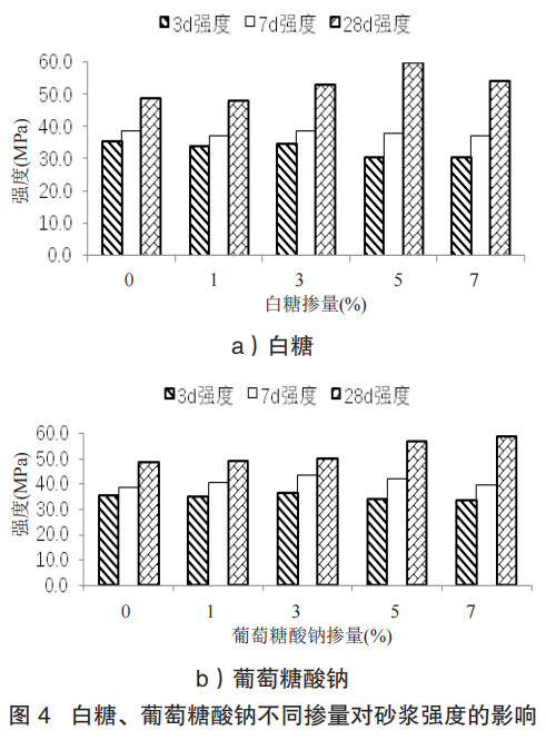 如圖 4a)所示,隨著白糖摻量從 0% 增加到 7%,砂漿 3d 強(qiáng)度呈下降趨勢,從 35.5MPa 降至 30.6MPa;各白糖摻量的砂漿 7d 強(qiáng)度值相近;28d 強(qiáng)度值呈先增加后下降的趨勢,當(dāng)白糖摻量為 5% 時(shí),28d 強(qiáng)度值達(dá)到 59.9MPa,比 0% 時(shí)增加 11.2MPa,摻量為 7% 時(shí),28d 強(qiáng)度比 0% 時(shí)只增加 5.4MPa。分析白糖對砂漿強(qiáng)度的影響,白糖對砂漿早期強(qiáng)度有不利的影響,但到 7d 時(shí),其強(qiáng)度值與 0% 摻量時(shí)相近,28d 后強(qiáng)度會隨白糖摻量增加而增大,在摻量為 5% 達(dá)到最大值,繼續(xù)增加會因白糖的超量,使強(qiáng)度降低。