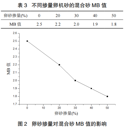 機砂 MB 值反映了機砂中細粉的吸附特性,混凝土在摻外加劑時,機砂 MB 值高低直接影響外加劑的摻量和混凝土保坍性能[4]。對卵砂混合山砂后的機砂 MB 進行了測試,結(jié)果見表 3 和圖 2。