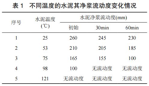 夏季外界環(huán)境溫度高,使得水泥降溫速率減慢,水泥出廠溫度往往高于冬季,運(yùn)輸過程中不能降溫,運(yùn)送到混凝土公司的水泥溫度偏高,有的甚至超過 80℃,造成水泥自身水化速度比較快。表 1 采用不同溫度的水泥進(jìn)行凈漿試驗(yàn),發(fā)現(xiàn)水泥溫度越高,初始、經(jīng)時(shí)流動(dòng)度均變小,且溫度越高影響越大。此外,水泥在粉磨過程中,磨機(jī)溫度升高使得部分二水石膏脫水變成半水石膏,由于兩者溶解速率的差異,造成不能有效控制水泥中 C3A 的水化,難以控制混凝土拌合物的坍落度損失。外加劑中的糖類緩凝劑和木質(zhì)素容易對硬石膏的溶解度產(chǎn)生影響,使用硬石膏作水泥緩凝劑時(shí)應(yīng)避免使用含有糖類物質(zhì)的外加劑。