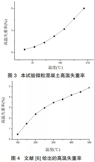 不同溫度下微?;炷恋母邷厥е芈剩ā鱩/m0)見表 3。其中△m 為加熱后微?;炷猎噳K損失的重量,m0 為常溫下試塊的重量。從圖 3 可以看出在 200℃ 范圍內(nèi),作用溫度對(duì)微?;炷恋母邷厥е芈视绊戄^為明顯,隨溫度升高混凝土的失重率將明顯上升。時(shí)旭東[6] 給出了普通混凝土在升溫至 500℃ 的過程中失重率的變化情況(如圖 4)。對(duì)比其在 100~200℃ 范圍內(nèi)失重率的數(shù)據(jù)可以發(fā)現(xiàn),該數(shù)據(jù)為一條近似直線,而本試驗(yàn)的曲線斜率越來越大。反映出微?;炷恋母邷厥е芈孰S溫度升高增加得越來越快。當(dāng)升高至同一溫度時(shí),對(duì)比普通混凝土,微?;炷烈蚋邷囟鴮?dǎo)致的水分損耗更多。本試驗(yàn)中的微粒混凝土的高溫失重率是文獻(xiàn) [6] 普通混凝土失重率的 3 倍,說明了混凝土的骨料粒徑對(duì)于高溫失重率有著較為明顯的影響:骨料粒徑越小,混凝土升溫后的失重率越大,損耗的水分越多。