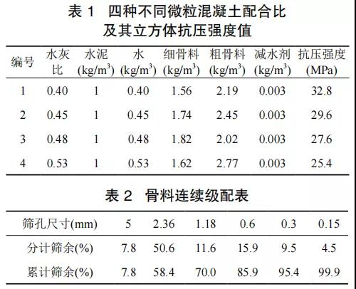 水泥采用海螺牌 P·O32.5 R 普通硅酸鹽水泥,粗骨料采用舟山碎石,細(xì)骨料采用 ISO 標(biāo)準(zhǔn)砂,細(xì)度模數(shù)為 2.74,骨料級(jí)配見表 2。試樣攪拌均勻后放置在振動(dòng)鋼平臺(tái)上振搗。24 小時(shí)后脫模,放入溫度 20℃、濕度 98% 的標(biāo)準(zhǔn)養(yǎng)護(hù)室養(yǎng)護(hù)。養(yǎng)護(hù) 28 天后進(jìn)行立方體抗壓強(qiáng)度測試,四組配合比的微?;炷恋牧⒎襟w抗壓強(qiáng)度值見表 1。試驗(yàn)結(jié)果表明:第 1 組配合比制作而成的微?;炷恋牧⒎襟w抗壓強(qiáng)度和 C30 混凝土相似,符合本試驗(yàn)預(yù)期要求。因此選用第 1 組配合比作為本試驗(yàn)的微?;炷僚浜媳取?/span>