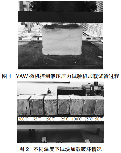 微?;炷恋目箟簭?qiáng)度試驗(yàn)采用 YAW 微機(jī)控制液壓壓力試驗(yàn)機(jī)。試驗(yàn)開始前,先將尺寸為 150mm×150mm×150mm 的微?;炷猎嚇臃胖迷跍乜叵渲屑訜?,溫控箱采用德國 Willi-Memmert GmbH 設(shè)備,最高加熱溫度可達(dá) 700℃。當(dāng)加熱到指定溫度后,維持該溫度 6 個(gè)小時(shí),確保微?;炷猎噳K溫度場均勻,模擬完全燒透狀態(tài)。取出加熱后的試塊,將其放置于壓力試驗(yàn)機(jī)上,將試塊與空氣接觸部分用石棉完全包裹,減少加載過程中試塊表面溫度的耗散(如圖 1)。通過適當(dāng)調(diào)整,保證試樣對(duì)中放置。緩慢加載,直至試樣壓裂破壞,由試驗(yàn)機(jī)直接讀出試樣破壞時(shí)的極限壓應(yīng)力,計(jì)算得到微?;炷恋牧⒎襟w抗壓強(qiáng)度。