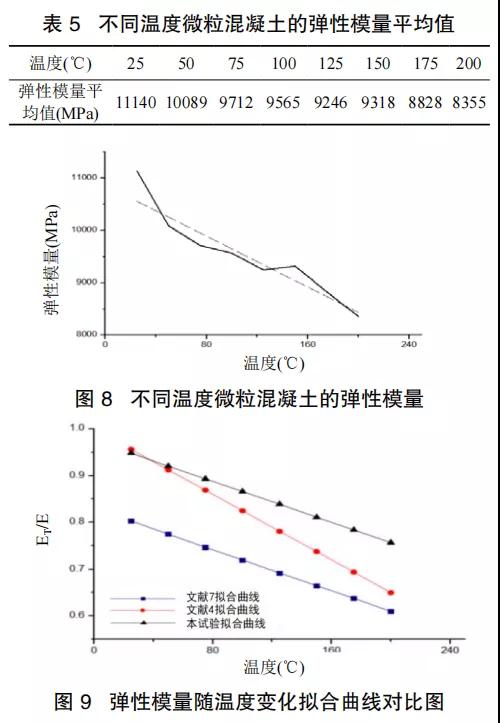 (4)溫度范圍在 200℃ 以內(nèi),微?;炷恋膹椥阅A侩S溫度的變化規(guī)律與普通混凝土相似,總體呈現(xiàn)下降趨勢,且當(dāng)溫度達(dá)到 125℃ 附近,彈模有回升趨勢。