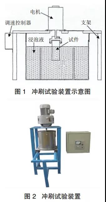 取出養(yǎng)護(hù)完成的混凝土試塊,去除混凝土試塊表面的水分,然后放置在自然環(huán)境下,待表面干燥后對(duì)試塊進(jìn)行稱重,記錄每塊試塊的原始重量。然后將試塊安裝在模擬海水沖刷裝置上(如圖 1、圖 2 所示),為防止沖刷液與錨接軸承接觸,在安裝前用防水的乙稀基樹脂對(duì)錨接軸承進(jìn)行密封。試驗(yàn)采用控制變量法,將沖刷速度作為變量,其它因素保持恒定,以一定濃度的海水作為沖刷液進(jìn)行試驗(yàn)。試驗(yàn)開始后,用 PHB-1 型酸度計(jì)(精度為 0.01),實(shí)時(shí)觀測(cè)沖刷液的濃度,同時(shí)釆用固定濃度的濃縮海水進(jìn)行滴定,以保持沖刷液濃度水平(1.07g/cm3)。本試驗(yàn)以沖刷速度為變量(0.5m/s,0.8m/s,1.25m/s),對(duì)不同配合比的試塊進(jìn)行 90d 的模擬海水沖刷試驗(yàn)。試驗(yàn)結(jié)束后將試樣取出,使用抹布將試塊表面水分擦掉,并放置于室內(nèi)一段時(shí)間,使試塊自然干燥,然后分別測(cè)量計(jì)算各組試件的質(zhì)量損失。
