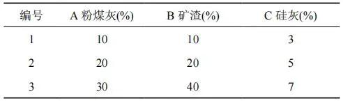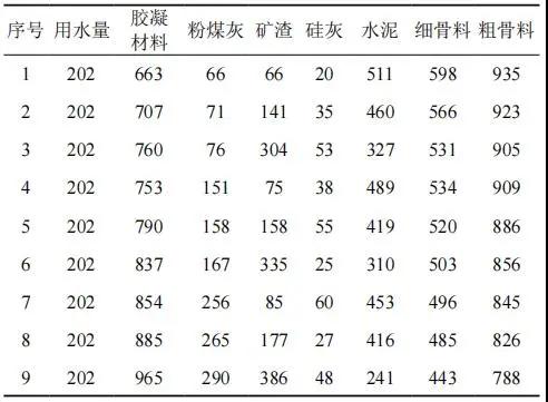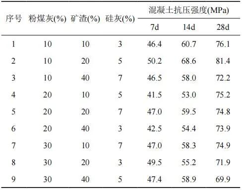 本試驗(yàn)選定三水平三因子正交設(shè)計(jì)安排試驗(yàn)。采用外摻粉煤灰、礦渣和硅灰的方法配制高性能混凝土,正交設(shè)計(jì)表見(jiàn)表 1。