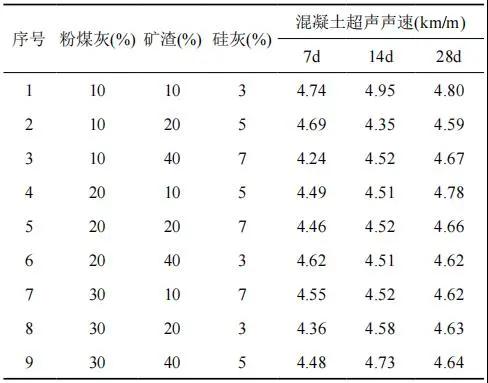 (2)礦渣摻量的增加,對(duì)強(qiáng)度有一定影響,摻量在 20% 時(shí)強(qiáng)度達(dá)到最大值,繼續(xù)摻加,強(qiáng)度有所下降。礦渣對(duì)聲速的影響是顯著的,因此,超聲檢測(cè)時(shí)需考慮礦渣摻量。