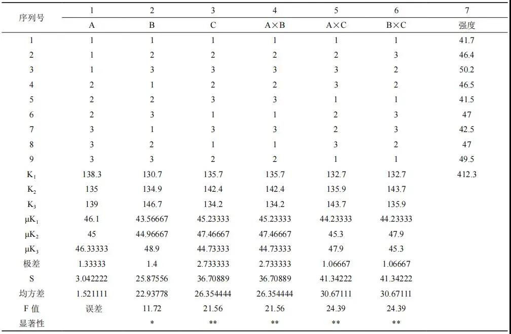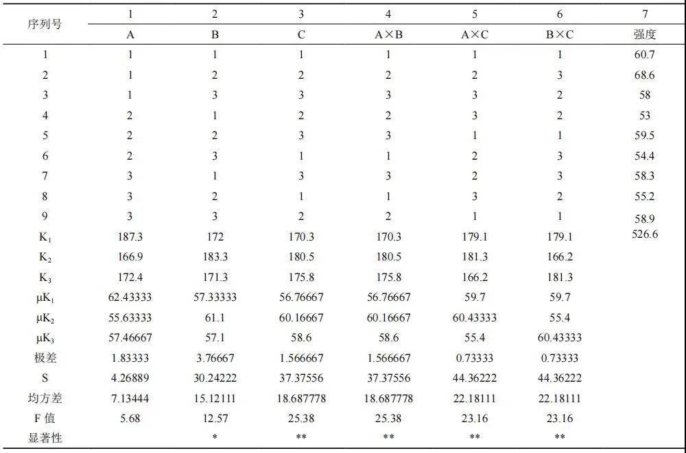 根據(jù)表 9,查 F 分布分位數(shù)表??梢钥闯?,礦渣對(duì)強(qiáng)度有影響,硅灰,粉煤灰、礦渣、硅灰之間的交互作用對(duì)強(qiáng)度的影響十分顯著。