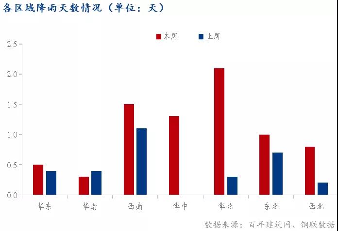 本周國內(nèi)145個城市降雨天數(shù)繼續(xù)減少,平均當(dāng)周影響混凝土出貨量的降雨天數(shù)為0.9天,環(huán)比增加125%。其中華北區(qū)域降雨量大幅增加2.1天,華中區(qū)域增加1.3天,部分項目因雨水天氣增多放緩施工進(jìn)度,加之企業(yè)間市場壓力大,出貨量明顯降低;另外華東、西南、東北和西北地區(qū)降水具有不同程度的增加。