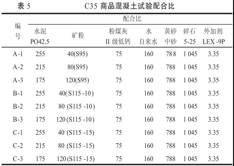 膠凝材料總量為370kg/m,固定水灰比為0.43,配制C35混凝土,其中固定粉煤灰摻量為膠凝材料的19%,礦粉摻量為11%、22%、32%。超細(xì)礦粉選取S115-10、S115-15兩種,并與S95礦粉進(jìn)行比較,具體配合比見(jiàn)表5。