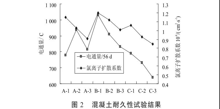 混凝土耐久性方面,從電通量或氯離子擴(kuò)散系數(shù)看,S115-15超細(xì)礦粉對(duì)混凝土耐久性更有利。建議采用S115-15超細(xì)礦粉配制普通混凝土,由于S115-15超細(xì)礦粉摻量對(duì)混凝土抗壓強(qiáng)度影響不大,建議摻量為10%~20%。