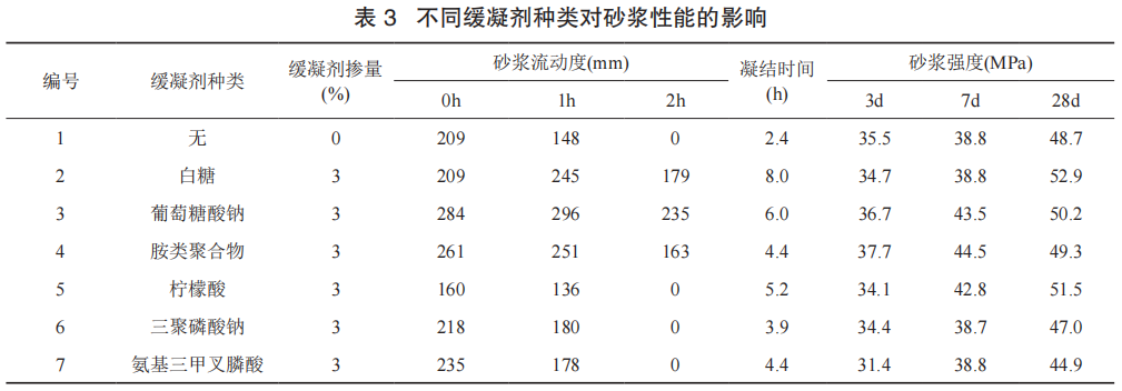 試驗(yàn)對比研究了不摻緩凝劑以及白糖、葡萄糖酸鈉、胺類聚合物、檸檬酸、三聚磷酸鈉、氨基三甲叉膦酸六種緩凝劑在 3% 摻量下砂漿的流動性、凝結(jié)時(shí)間和抗壓強(qiáng)度,結(jié)果見表 3。