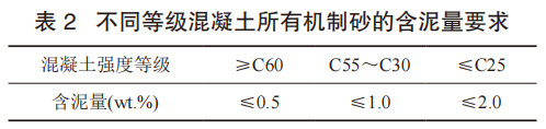 經(jīng)試驗證明,機制砂中不同的含泥量對混凝土拌合物有著一定的影響,對低強度等級混凝土的影響比高等級混凝土影響要小。因此,不同等級的混凝土所用機制砂中含泥量應(yīng)符合表2要求。