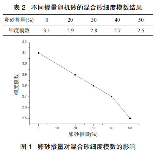 砂漿和骨料之間的填充效果直接影響混凝土工作性能和硬化后的混凝土密實度和勻質(zhì)性,卵砂和山砂混合使用,要確定摻加比例,需要對混合后砂的級配情況進行研究。按照設(shè)定摻量,將卵砂和山砂進行充分混合,測試混合砂的細度模數(shù),結(jié)果見表2、圖 1。