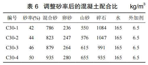 參考上述試驗結(jié)果,按照卵砂和山砂比例 3:7,混合砂的細度模數(shù)為 2.8,所得的混凝土配合比見表 6。