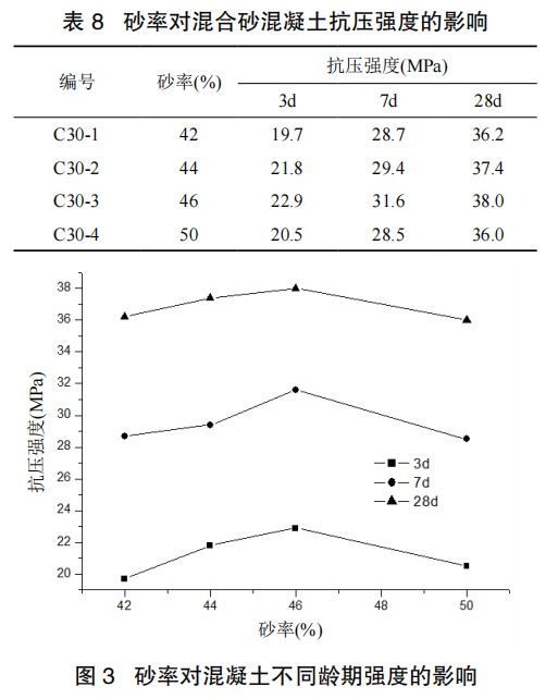 表 8 和圖 3 結(jié)果顯示,砂率從 42% 增加至 50%,混凝土 3d、7d 和 28d 抗壓強度先增加后降低,當(dāng)全機砂混凝土砂率在 46% 時,混凝土各齡期強度最高,此后砂率增加,混凝土強度有所下降。
