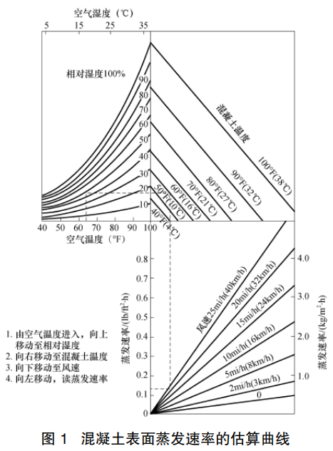 夏季氣溫高,再加上風(fēng)的作用,水份蒸發(fā)快,對此李家正翻譯的《混凝土技術(shù)》中進(jìn)行了形象描述(如圖 1),保濕養(yǎng)護(hù)是控制混凝土拌合物失水造成塑性收縮裂縫的有效措施。混凝土澆筑搗實(shí)后,適當(dāng)?shù)臏囟扰c濕度是保證水泥水化的重要條件,養(yǎng)護(hù)不當(dāng)可能導(dǎo)致混凝土表面迅速出現(xiàn)塑性的收縮裂紋,也會(huì)影響水泥水化造成混凝土強(qiáng)度降低。因此,保濕養(yǎng)護(hù)工作是夏季混凝土澆筑的一個(gè)重要環(huán)節(jié),應(yīng)按要求精心進(jìn)行養(yǎng)護(hù)工作。