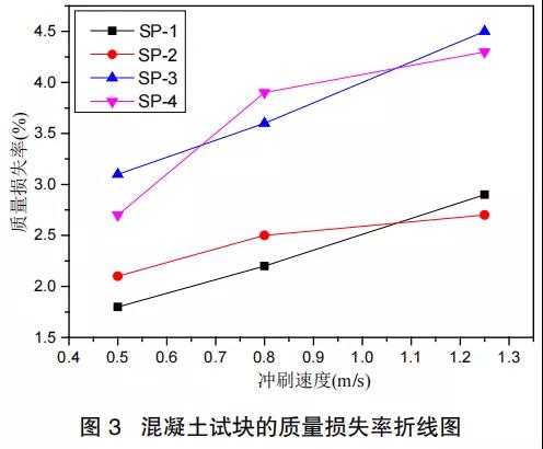 由圖 3 中可知,當(dāng)模擬海水沖刷速度為 0.5m/s、0.8m/s 時(shí),SP-1 所對(duì)應(yīng)的配合比制備的混凝土試塊的耐沖刷性能最好;當(dāng)沖刷速度達(dá)到 1.25m/s 時(shí),SP-2 所對(duì)應(yīng)的配合比混凝土試塊的耐沖刷性能最好。從圖中還可以看出,隨著沖刷速度的增大,SP-1 對(duì)應(yīng)的折線的斜率幾乎不變,但 SP-2 對(duì)應(yīng)的折線的斜率在減小,說明當(dāng)沖刷速度繼續(xù)增大,SP-2 對(duì)應(yīng)的配合比混凝土試塊的質(zhì)量損失率的增加速度與 SP-1 相比逐漸減小,兩者的質(zhì)量損失率的差距逐漸增大。從表 3 中可以看出,當(dāng)沖刷速度為 0.5m/s 時(shí),SP-1 對(duì)應(yīng)配合比混凝土試塊的質(zhì)量損失率比 SP-2、SP-3、SP-4 分別降低 14%、42% 和 52%;當(dāng)沖刷速度為 0.8m/s 時(shí),SP-1 對(duì)應(yīng)的配合比混凝土試塊的質(zhì)量損失率比 SP-2、SP-3、SP-4 分別降低 12%、39% 和 44%;當(dāng)沖刷速度為 1.25m/s 時(shí),SP-2 對(duì)應(yīng)的配合比混凝土試塊的質(zhì)量損失率比 SP-1、SP-3、SP-4 分別降低 7%、40% 和 37%。根據(jù)數(shù)據(jù)對(duì)比以及折線圖比較,當(dāng)沖刷速度<1m/s 時(shí),SP-1 對(duì)應(yīng)的配合比混凝土試塊的耐沖刷性能最好;當(dāng)沖刷速度>1m/s 時(shí),SP-2 對(duì)應(yīng)的配合比混凝土試塊的耐沖刷性能最好,所以試驗(yàn)人員可以根據(jù)混凝土所處的實(shí)際環(huán)境來選擇合適的配合比。