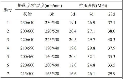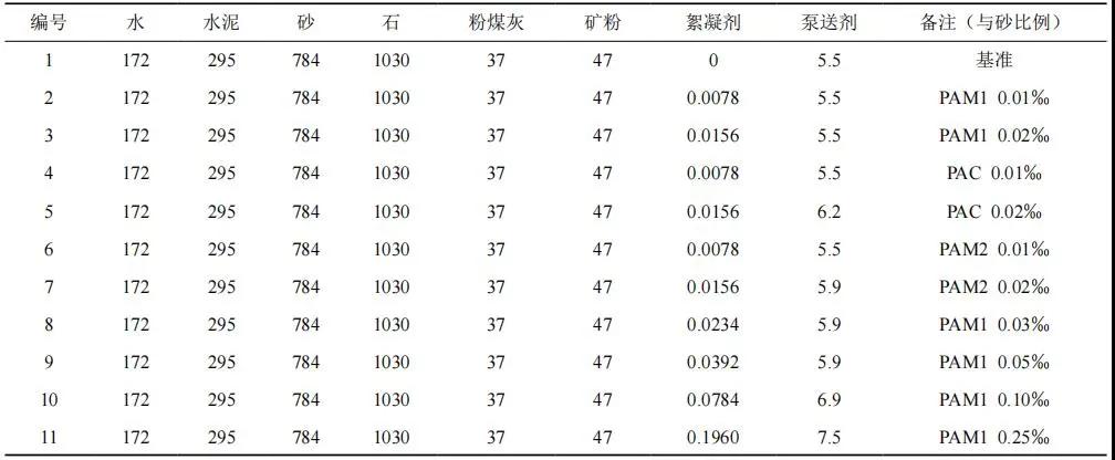 選用陰離子 1200 萬分子量的聚丙烯酰胺(PAM1)、陰離子分子量為 800 萬的聚丙烯酰胺(PAM2)、聚氯化鋁(PAC)按不同摻量加入 C30 混凝土中進行試驗,配合比如表 5 所示。